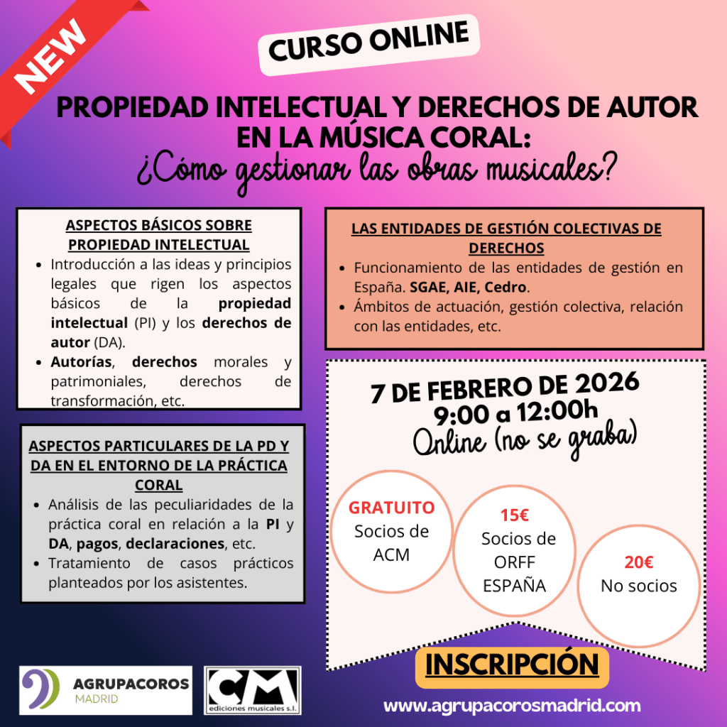 Por primera vez en Madrid, se ofrece un curso especializado en Propiedad Intelectual y Derechos de Autor aplicado a la música coral: un espacio claro, práctico y pensado específicamente para músicos que necesitan entender de verdad, cómo gestionar obras musicales sin complicaciones ni sustos.
